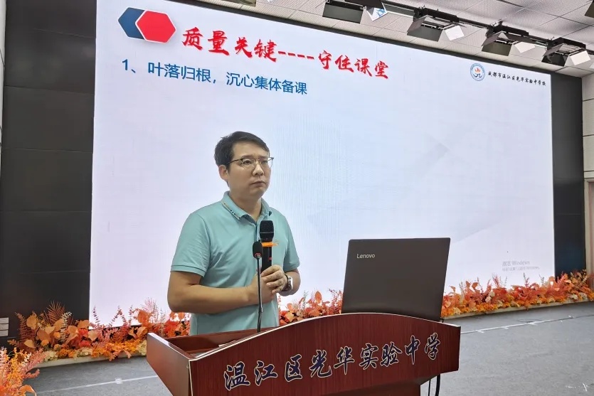分管教学副校长古学东紧扣教育高质量发展目标,以“躬耕细作抓课堂,提升质量铸品牌”为题部署教学工作,提出“聚光课堂”三课模式,优化集体备课、细化课堂管理、创新作业设计等绿色提质路径,强调作业“闭环管理”、教辅材料“十严禁”、落实“双减”政策等要求。