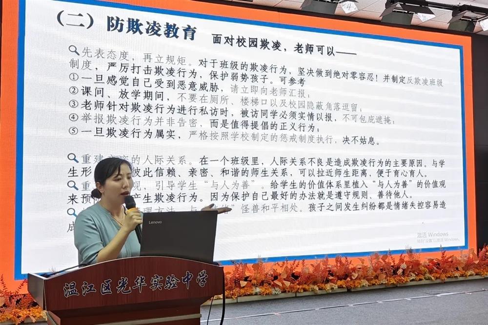 分管德育副校长笪勤从“近期重点”与“学期规划”安排德育工作,近期推进入学收心教育、学生心理健康排查,筹备9月教育活动;学期内以“月度主题,周周实践”推进工作,细化常规管理,加强防欺凌教育,强化班主任培训,健全家校沟通机制,依托“光华币”评价体系激发学生成长动力,提升“三全育人”实效。