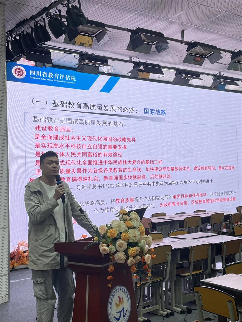 活动伊始,四川省教育评估院刘子豪老师作题为《基于问题整改的数学检测结果反馈与运用指导》的专题报告,从“为什么监测”“监测是什么”“怎么实施监测”“监测结果怎么样”对数学学科报告进行整体解读。他从统计监测角度出发,系统阐释了如何通过监测数据发现真问题、推动真整改,引导教师从数据中读懂教学背后的逻辑与改进方向。