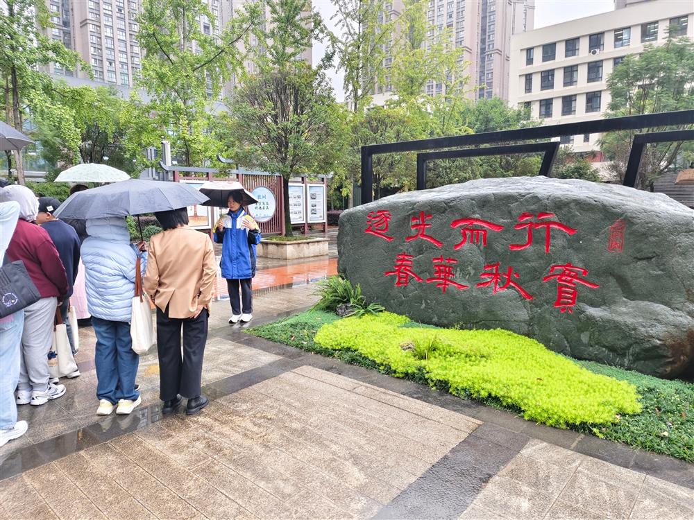 在学校文化石前,8年级8班的钟子心同学介绍了创作“逐光而行,春华秋实”的心路历程,以及自己学习书法的过程中的艰辛与收获。