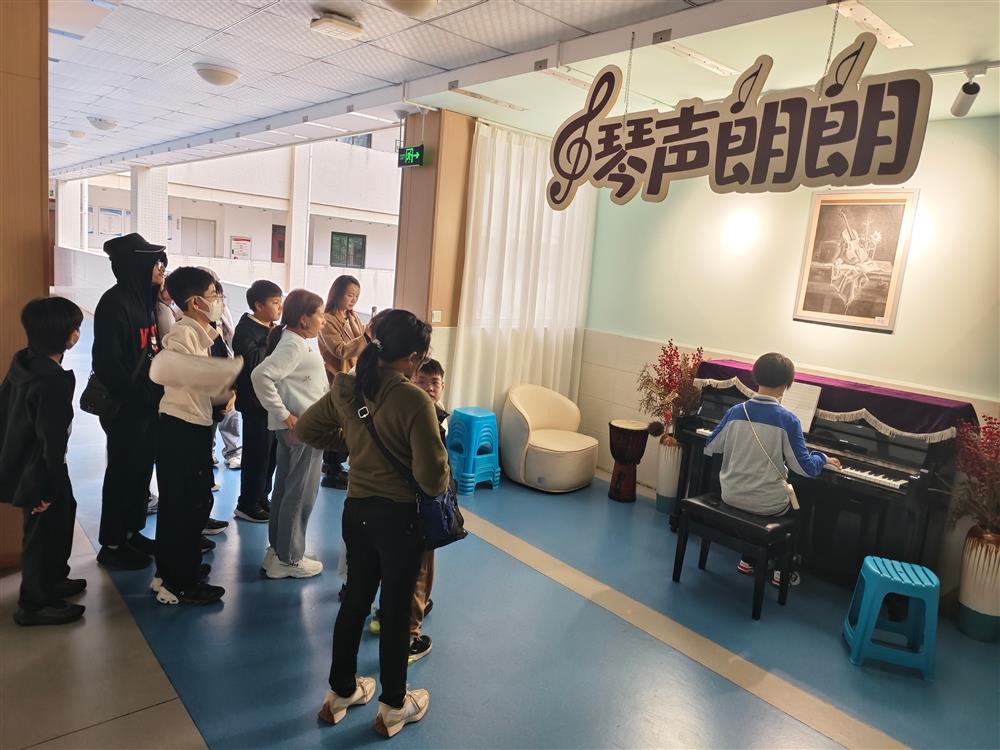 在“琴声朗朗”艺术休闲区,8年级7班同学王佑州介绍道:“这个区域是我校园生活中的宝藏天地,这几架电钢琴是家长友情捐赠的,构建起音乐休闲的放松区,我和同学常来这里弹奏乐曲,当指尖触碰琴键,悠扬的旋律便会驱散学习的疲惫。”