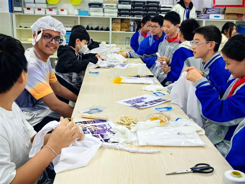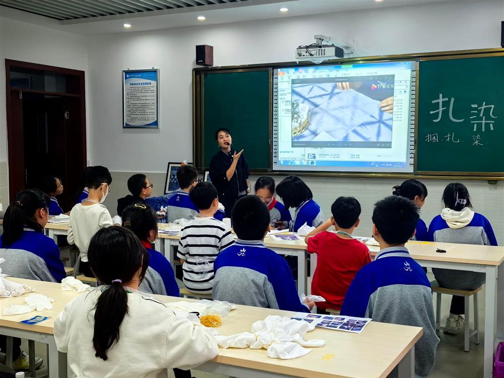 课堂上,冉艳老师讲解扎染的历史与文化内涵,从传统纹样寓意到染色技艺演变,生动讲解让泰国师生眼中放光。