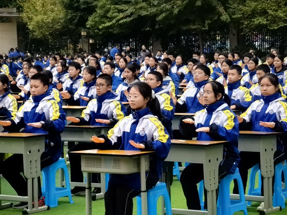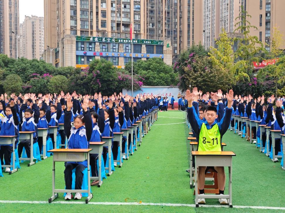 音乐响起,八年级学子展示由体育彭琴、周应钰等老师精心编排的室内课间操。赛场上,同学们动作整齐划一,身形舒展如画,展现了良好的精神风貌。