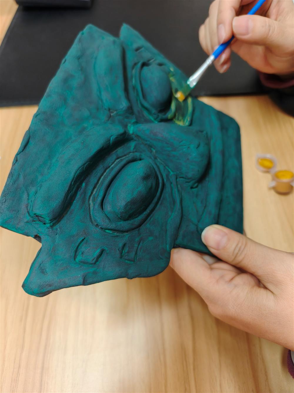 理论学习之后,仿制实践环节精彩启幕!同学们分组合作,化身“少年工匠”:捏制的陶器质地温润,朴素器形中藏着古人的生活哲思;复刻的青铜编钟庄重古朴,纹饰间流淌着商周礼乐文明的基因;仿制的商鞅方升刻度精准,承载着秦国变法革新的制度智慧;还原的三星堆面具神秘诡谲,折射出古蜀文明的奇幻想象力。每一件作品都凝聚着对历史的敬畏,让沉睡千年的文物在校园中 “重生”。