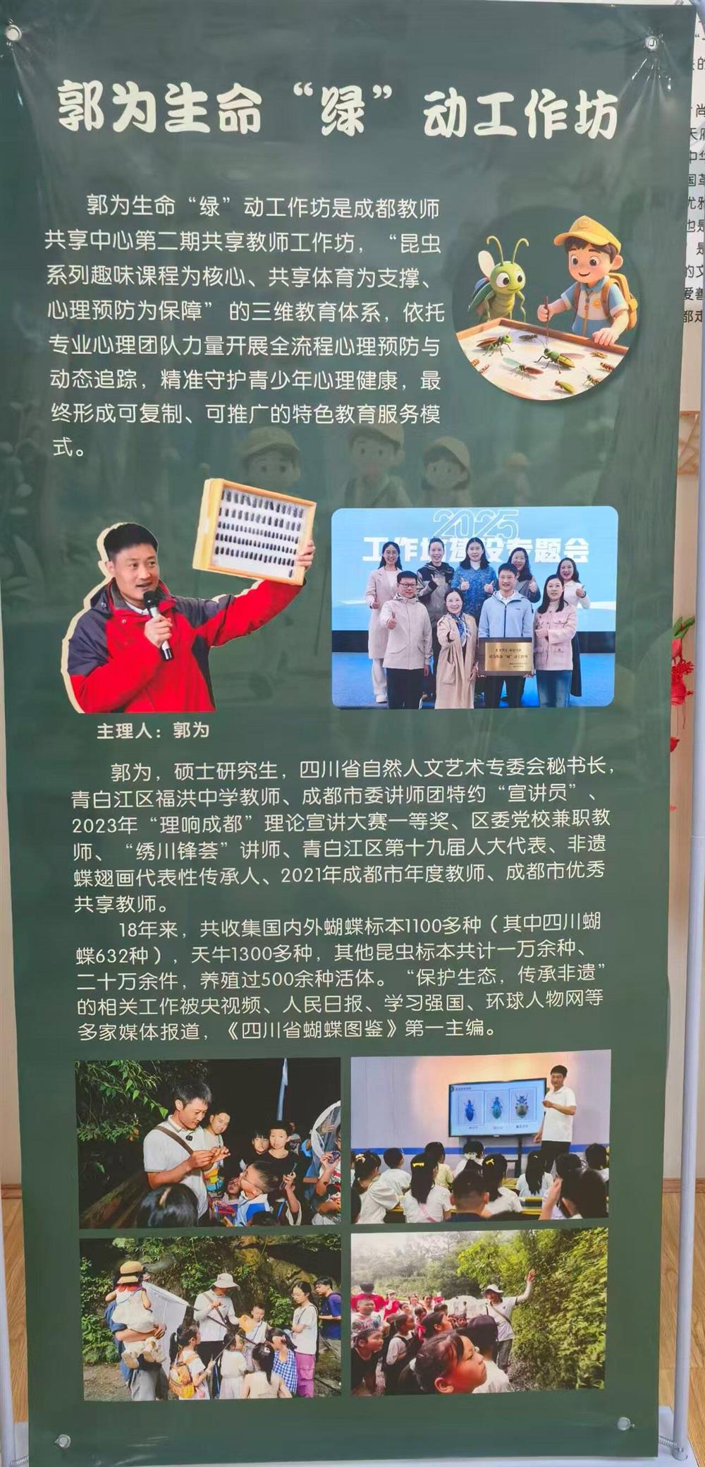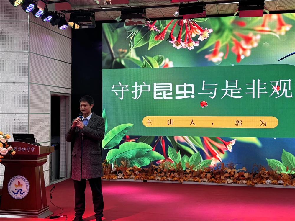 为进一步推进自然教育与心理、科学教育的深度融合,引导学生树立尊重生命的正确观念,培育科学探究精神,提升生态保护意识与社会责任感,2025年12月11日,由成都市教师共享中心主办,温江区光华实验中学校(郭为生命“绿”动工作坊)承办的自然教育与体教融合系列课程讲座在我校举行。讲座以“守护昆虫与是非观”为主题,面向初一年级学生讲解。