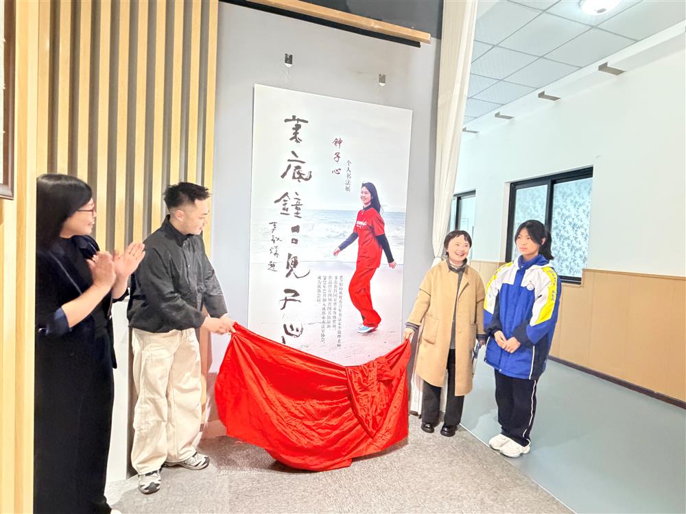 在全体嘉宾的见证下,校领导、书法指导老师、家长代表与钟子心同学共同为展览揭幕。随着红绸缓缓落下,展厅内响起热烈的掌声,宣告着钟子心个人书法展正式开展。