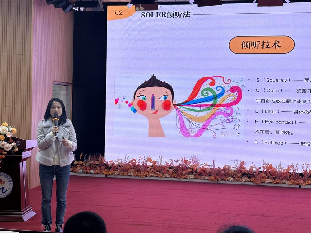 核心技能传授环节,蓝老师讲解了心理危机“红灯黄灯”识别信号要点,拆解成绩断崖式下跌等“黄灯”关注信号、流露轻生想法等“红灯”紧急信号;并通过现场示范,教授“面对对方、姿势开放、身体前倾、温和对视、保持放松”的SOLER专业倾听法。