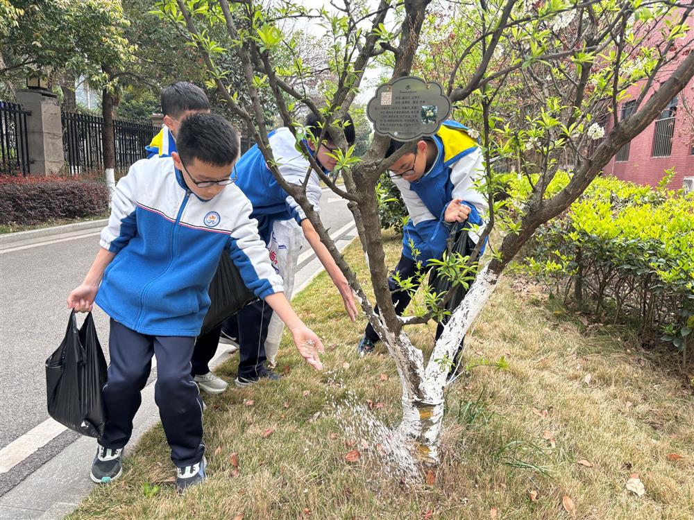 在校内,护绿行动有序进行。同学们在劳动教师的指导下,学习施肥修剪的技能,为树木施肥、整理扎带、修剪玫瑰枝叶,细心呵护校园一草一木。他们用双手美化校园环境,在劳动实践中体会劳动的快乐,让绿色理念扎根心底。