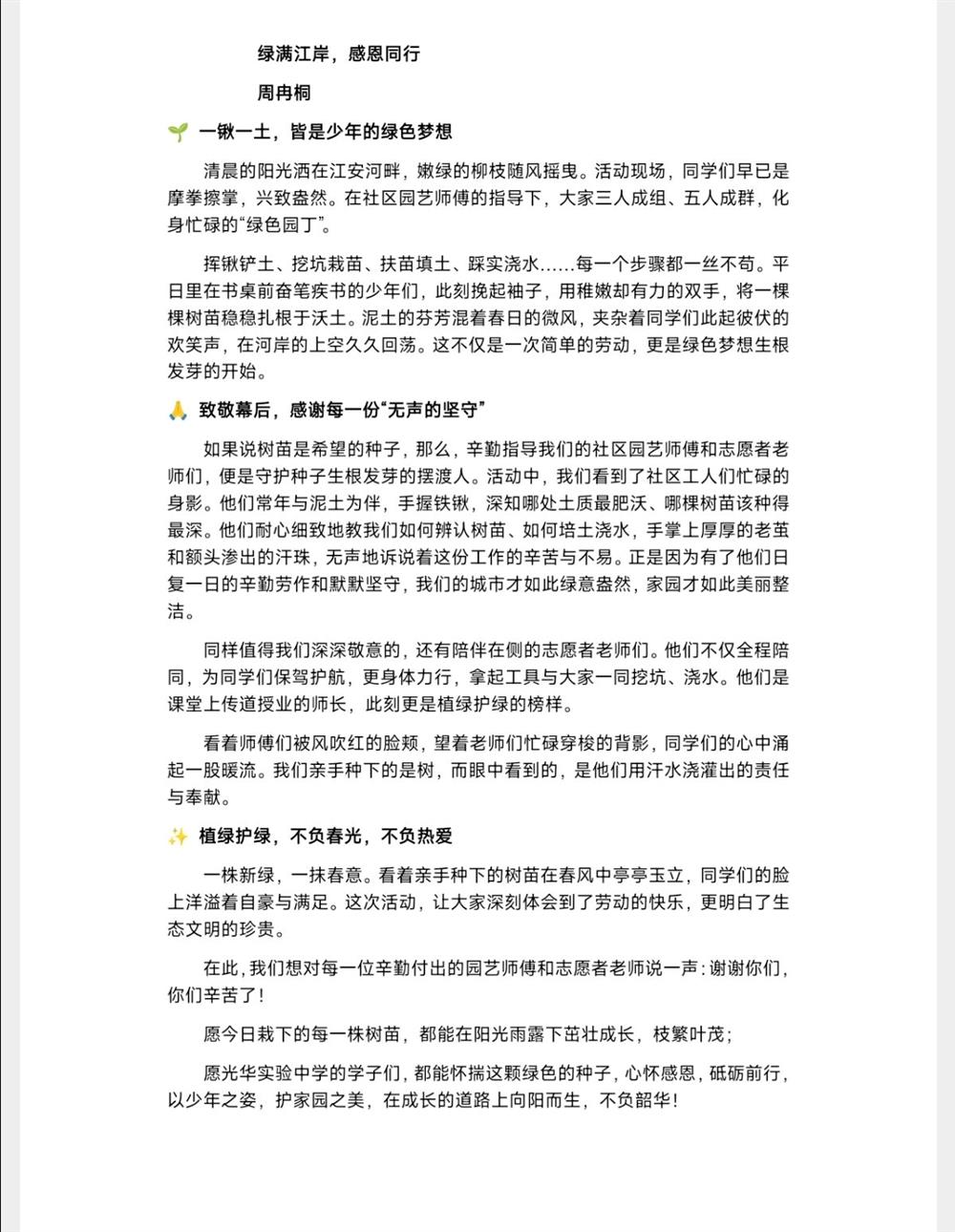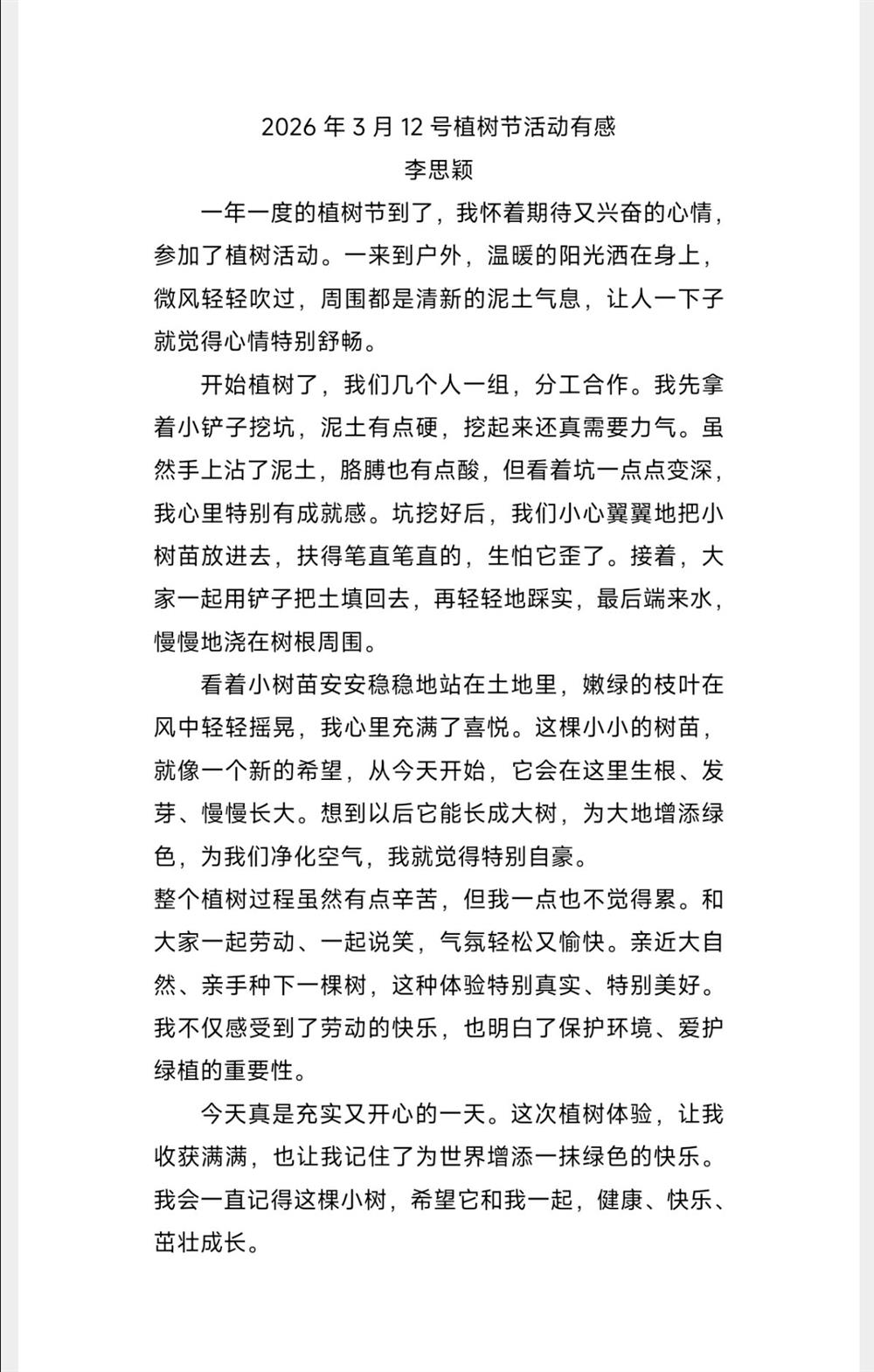 “我小心翼翼地将小树苗扶正,一锹锹泥土覆盖根系,一遍遍清水滋润新芽。看着它笔直地挺立在春风中,心中满是欢喜与自豪。”一位参与活动的同学这样记录下自己的感受。