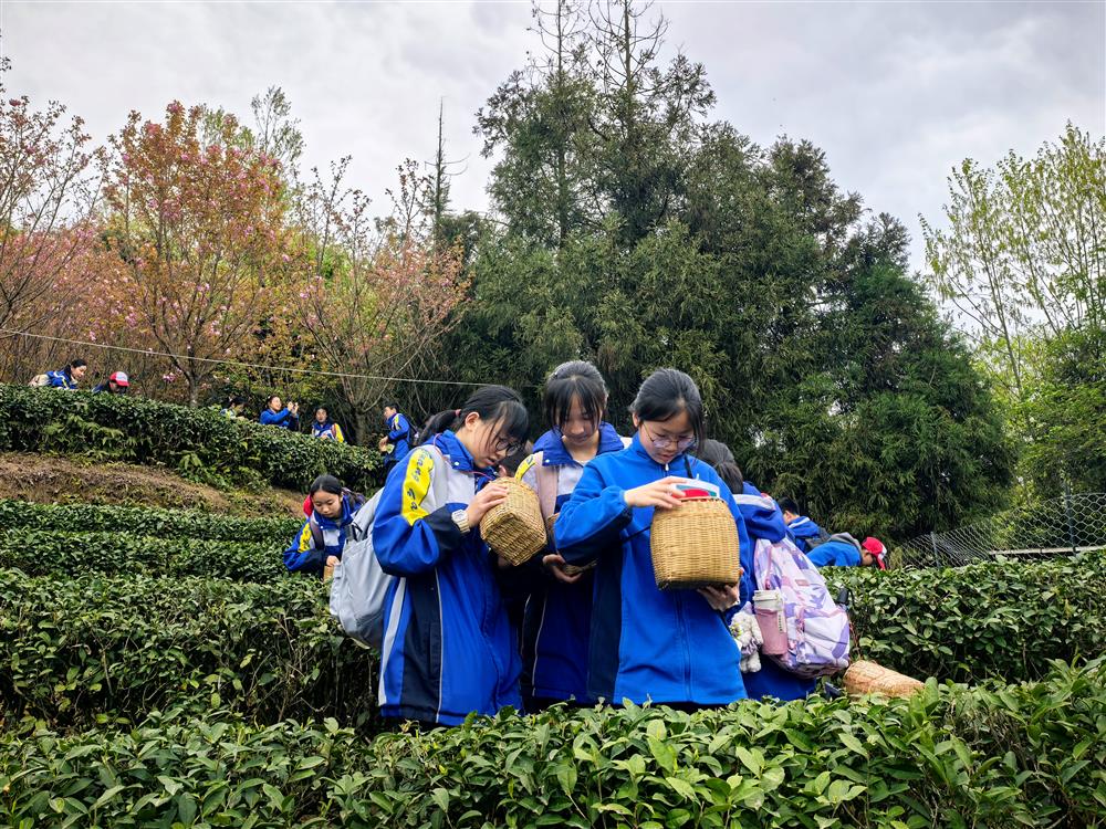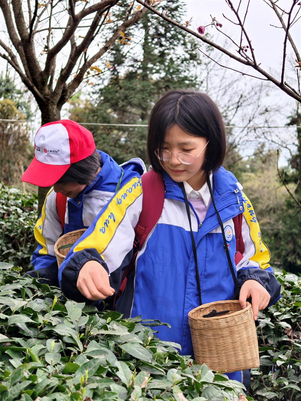 【亲身体验采茶之乐】工作人员为每位同学分发竹篓,细致讲解采茶技巧——“一芽一叶,轻捏轻放”。同学们分组走进茶园,弯腰俯身,指尖轻捻嫩绿的茶芽,在欢声笑语中感受劳动的乐趣,体会每一片茶叶背后的辛劳。阳光透过枝叶洒在同学们的笑脸上,竹篓里的新茶渐渐充盈,也装满了收获的喜悦。